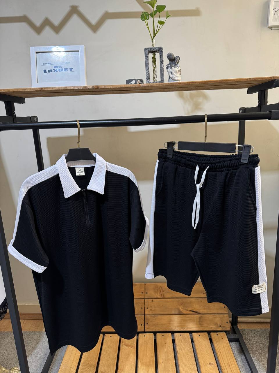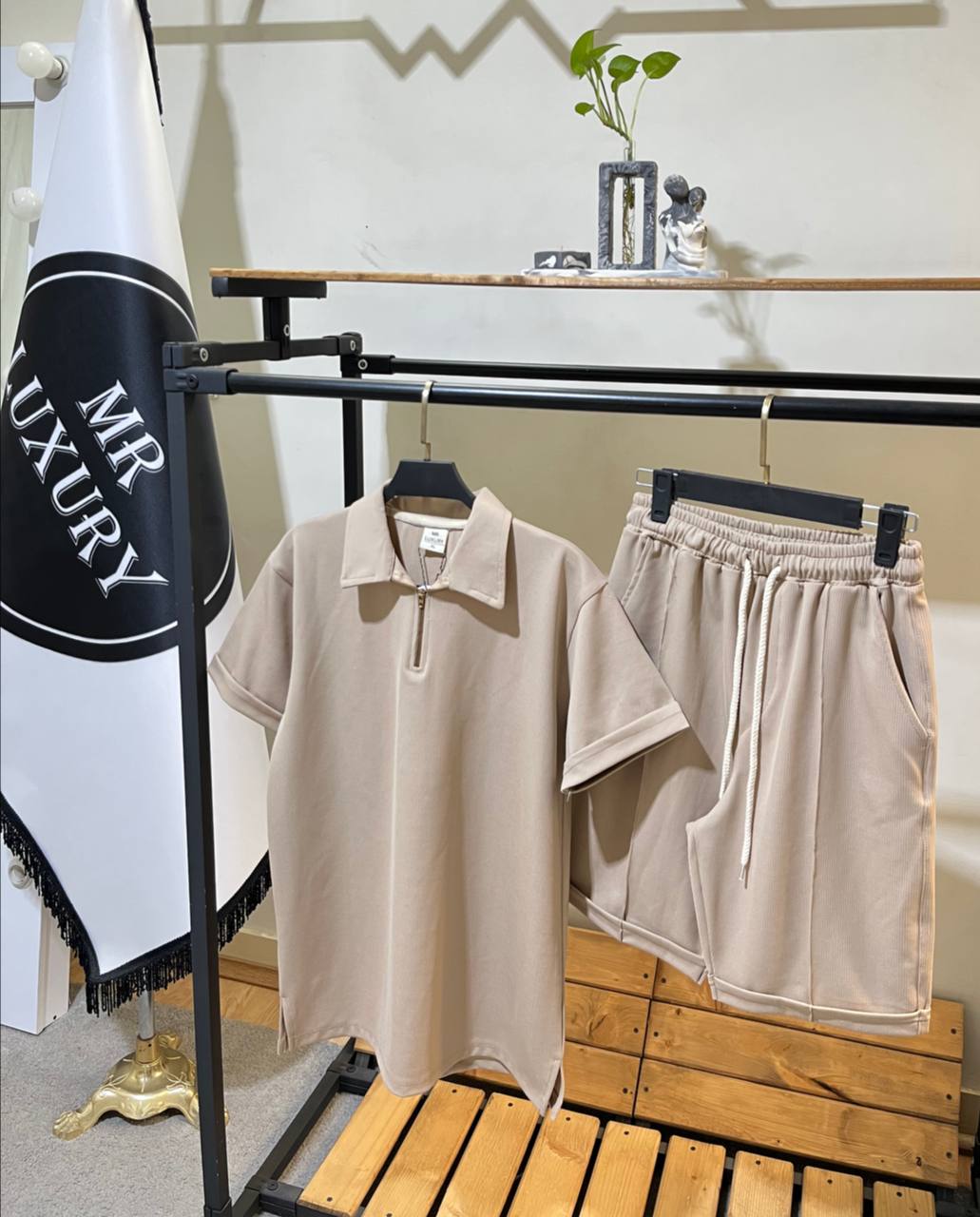 ست پیرهن شلوارک مردانه مدل یقه نیم زیپ جنس مراکشی